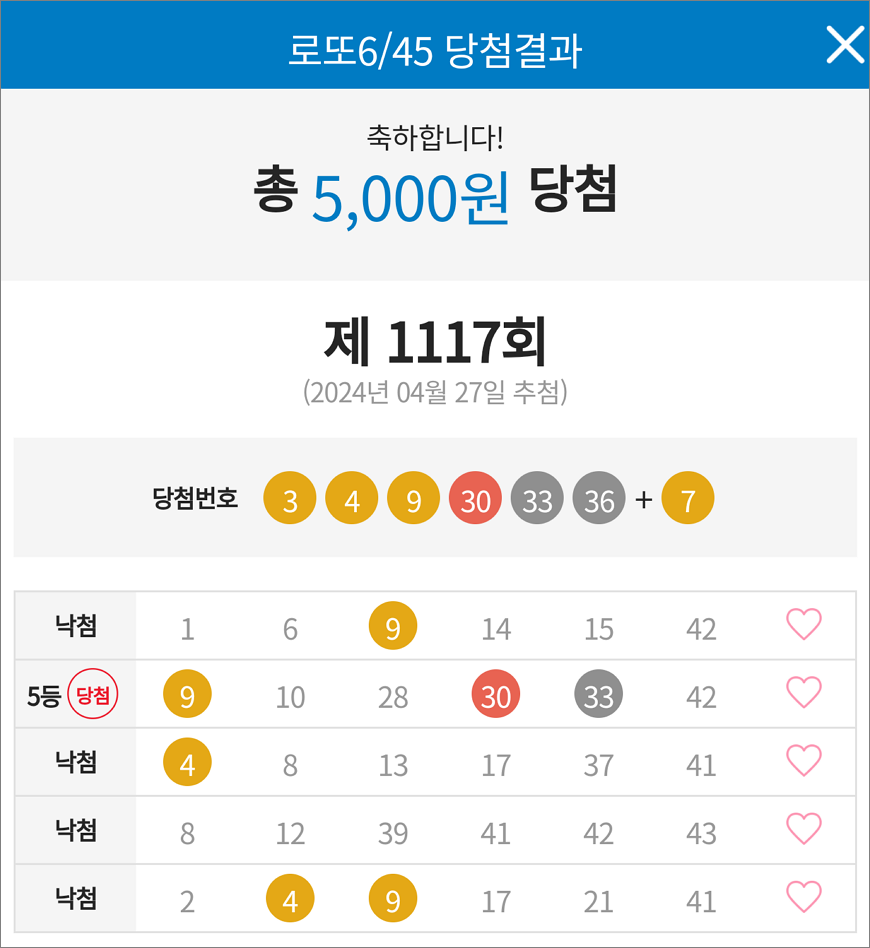 로또 1117 당첨 5등 1장