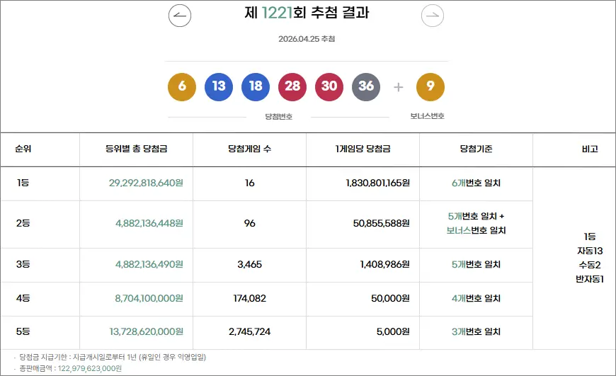 로또 1221회 1등 당첨은 자동 13장, 수동 2장, 반자동 1장으로 1장당 당첨금은 1,830,801,165원 입니다. 2등 당첨은 96장으로 당첨금은 50,855,588원 입니다. 로또 1222회 예상번호 및 제외수 분석 데이터는 이 포스팅을 통해 매주 토요일까지 실시간으로 데이터를 수정 및 추가하며 업데이트하고 있습니다.