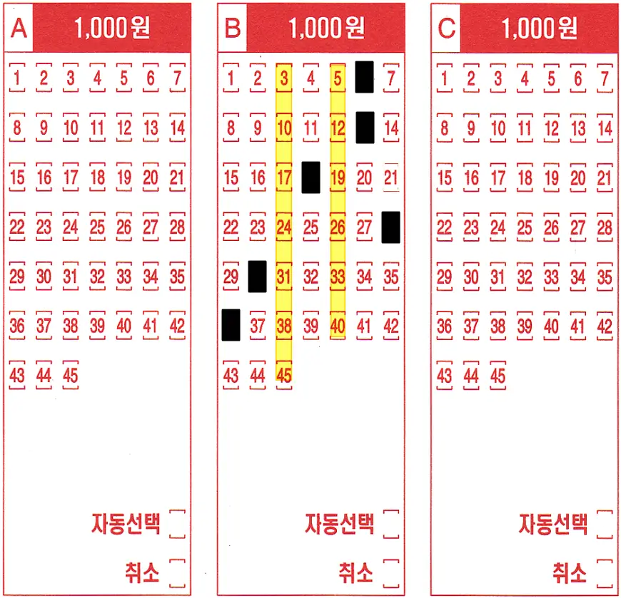 용지 패턴은 여러가지가 있지만 너무 복잡해지기 때문에 아래 세 가지 정도만 확인합니다. 로또 1221회차의 경우 가로 빈 줄이 나오지 않았습니다. 가끔 이렇게 가로 또는 세로 빈 줄이 나오지 않습니다.